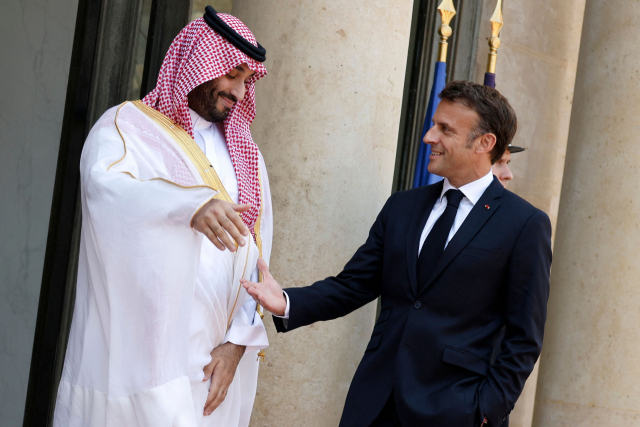 프랑스를 방문한 무함마드 빈 살만 사우디아라비아 왕세자(왼쪽)가 16일(현지시간) 파리 엘리제궁에서 에마뉘엘 마크롱 대통령의 영접을 받고 있다. 이날 양측은 중동 문제, 우크라이나 지원 등 국제 현안에 대해 논의할 예정이다. 연합뉴스