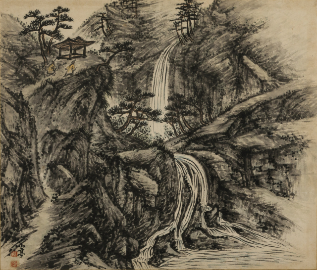 1959년 작품인 ‘관폭도’는 후기 시기에 제작된 작품으로 변관식풍 화법을 잘 드러낸다. 과감한 구도로 이루어진 화면을 가득 채우고 있는 것은 야산의 정취를 담아낸 거친 필법이다. 투박한 붓질은 험한 산세와 거센 폭포의 물결을 고스란히 전달한다. 정자를 향해 올라가는 인물은 야산의 정취를 물씬 풍기는 화면의 분위기를 전환한다.
