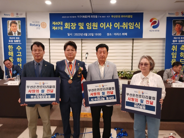 부산온천로타리클럽은 지난 20일 부산진구 이리스웨딩뷔페에서 제40대 41대 회장 이·취임식에 갖고 축하쌀 1030kg을 부산보훈청, 무료급식소 (사)우리나눔 봉사단, 바라밀회에 전달했다.