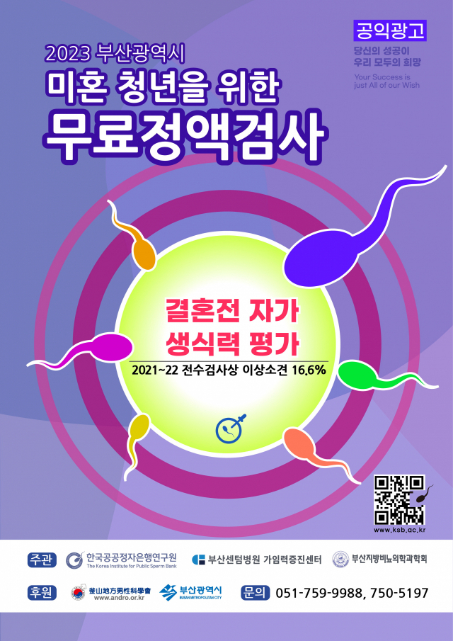 올해 지원 대상은 미혼 청년층 600명이며, 사업 기간은 올 연말까지다. 미혼 청년과 혼인신고 전 예비 신랑, 혼인신고 후 무자녀 상태에서 임신을 준비하고 있는 남성이 대상이다. 희망자는 온라인(이메일 kspermbank1@gmail.com)으로 신청한 후 정액검사 일정을 잡고 검사 결과 확인과 상담 절차로 진행한다. 자세한 문의는 부산센텀병원 비뇨의학과와 한국공공정자은행연구원으로 하면 된다.