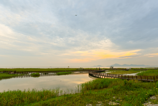 고우니생태길. 넓은 갯벌과 갈대숲 사이에 나무 덱이 설치돼 있고, 덱 곳곳에 전망대와 쉼터가 있다.