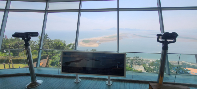아미산전망대 실내에서 바라본 낙동강 하구 전경.