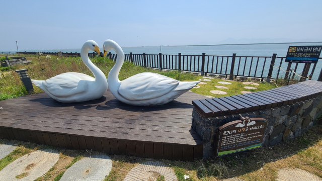고니나루쉼터에 있는 큰고니 조형물. ‘백조’로 불리는 큰고니는 겨울철 낙동강 하구를 찾아오는 겨울철새다. 큰고니는 부부의 연을 맺으면 평생 사랑을 나누며 살아가기 때문에 ‘영원한 사랑’을 상징한다.