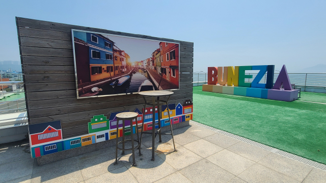 부네치아 선셋 전망대 1층은 수산식품판매장, 2층은 홍보관·카페테리아, 3층은 옥상전망대다. 옥상전망대에 오르면 ‘BUNEZIA’ 일곱 글자에 무지개 일곱 빛깔을 입힌 조형물이 인상적이다.