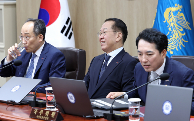 추경호 경제부총리 겸 기획재정부 장관(왼쪽부터), 권영세 통일부 장관, 박민식 국가보훈부 장관이 27일 서울 용산 대통령실 청사에서 열린 국무회의에 참석하고 있다. 연합뉴스