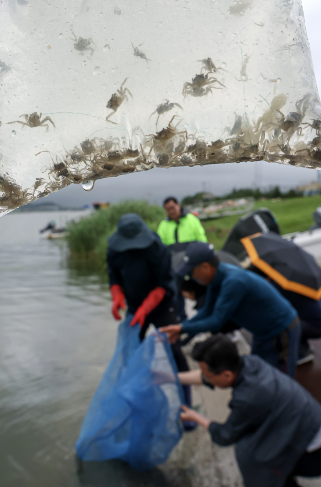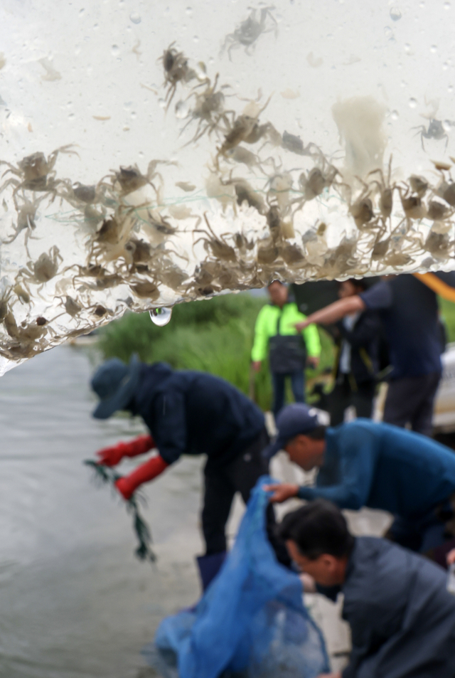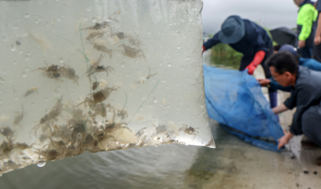 29일 오후 부산 강서구 서낙동강 조정카누경기장 인근 낙동강 유역에서 부산시 수산자원연구소 관계자들과 어업인들이 어린 동남참게를 방류하고 있다. 수산자원연구소는 7월 5일까지 한국수자원공사 부산권지사와 어린 동남참게 16만 마리를 방류할 계획이다. 이번 방류는 수산자원을 보강해 생태복원과 어업인 소득 향상을 위해 마련됐다. 방류되는 동남참게는 부산시 수산자원연구소가 산란, 부화시켜 전갑 폭 0.7cm 이상으로 키워낸 지역 어업인의 선호도가 높은 품종으로 2014년 처음 종자생산에 성공해 지난해까지 총 187만 마리를 방류했다.