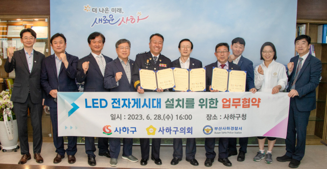 부산 사하구청(구청장 이갑준)은 최근 사하구의회(의장 채창섭)·경찰서(경찰서장 유병조)와 범죄예방·자치경찰사무 지원을 위한 ‘LED 전자게시대 설치 업무 협약’을 체결했다.
