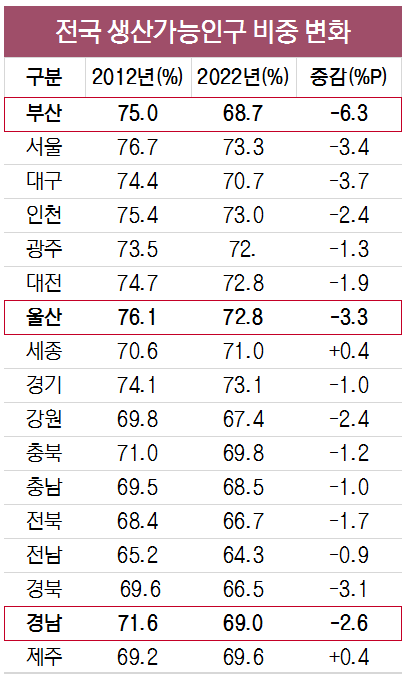3일 〈부산일보〉와 중소기업중앙회 부산울산본부가 통계청 자료를 바탕으로 공동으로 조사한 결과, 부산의 15~64세 생산가능인구 비율은 2012년 75.0%에서 2022년 68.7%로 -6.3%P 줄었다. 이는 전국에서 가장 감소 폭이 크다. 전국적으로 생산가능인구가 줄어드는 추세이긴 하지만 그중에서도 부산의 감소 폭이 전국에서 가장 심각하다는 의미다. 인구 고령화와 더불어 청년 인구의 지속적인 수도권 유출 때문으로 풀이된다.