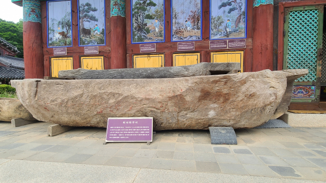 승보전 전각 옆에 있는 송광사의 명물 ‘비사리구시’. 쌀 7가마(4000명분)의 밥을 담을 수 있다고 한다. 1742년 전북 남원에 있었던 큰 싸리나무가 태풍으로 쓰러지자 이것을 가공하여 만들었다는 전설이 전해진다.
