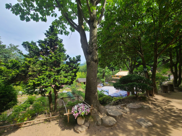 법정스님이 아끼고 사랑했던 후박나무. 유언에 따라 법정스님 육신의 재는 후박나무 아래에 모셨다.