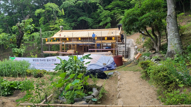 불일암 텃밭 옆에는 기존에 있던 불일암 하사당을 새롭게 짓는 공사가 한창이다. 하사당 역시 법정스님이 머물렀던 곳이다. 목재가 썩어 붕괴 위험이 있었다고 한다.