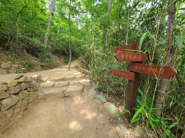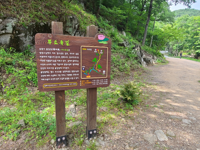 산길을 따라 잠시 걷다 보면 갈림길과 만난다. ‘불일암(무소유 길)’이라고 적힌 이정표가 안내하는 왼쪽 길(시멘트로 포장된 길)을 따라 올라가면 법정스님이 생전에 걸었던 ‘무소유 길’이 나온다.
