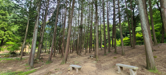 송광사 일주문 밖에 있는 편백나무 숲. 벤치에 앉아 삼림욕을 즐길 수 있다.