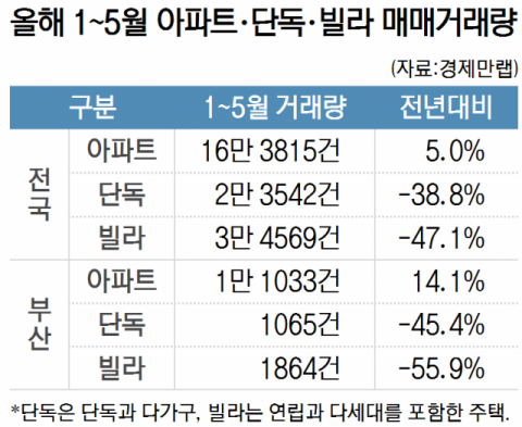 부산도 1~5월 아파트 매매거래량은 14.1% 증가했지만 단독·다가구와 연립·다세대 주택은 각각 45.4%와 55.9% 급감했다.