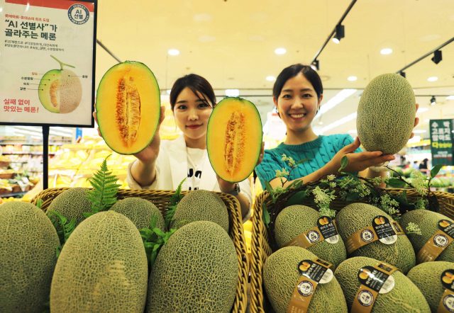 롯데마트가 6일부터 13일까지 AI 시스템으로 당도가 높은 하미과 멜론을 선별해 판매한다. 모델들이 AI로 선별한 하미과를 소개하고 있다. 롯데마트 제공