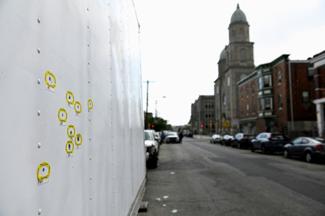 4일(현지 시간) 총격 사건이 발생한 필라델피아에 주차된 트럭에 탄흔 여러 개가 선명하게 남아있다. 로이터연합뉴스
