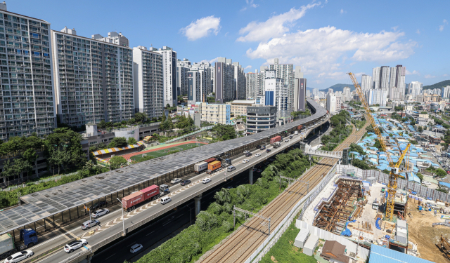 5일 부산 사상구 주례동 주양초등학교 인근 전경. 현재 동서고가와 아파트 담벼락에 둘러싸인 이 학교는 맞은편으로 28층 152세대 규모의 아파트 건립이 추진돼 조망권 상실 위기에 처했다. 김종진 기자 kjj1761@