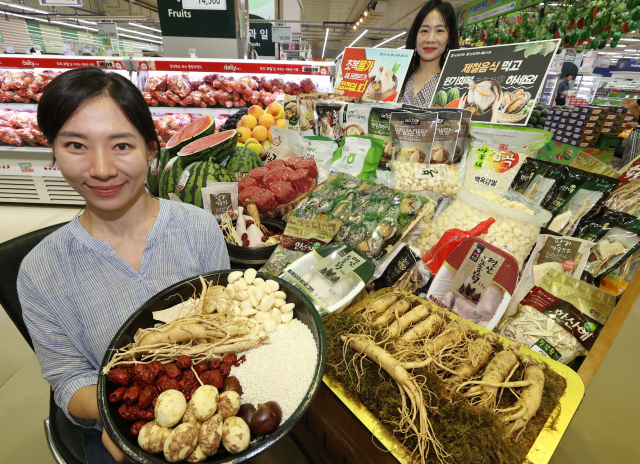 농협유통은 대표 보양식 재료인 삼계탕용 통닭과 전복, 복숭아 등 제철 농축수산물을 오는 12일까지 최대 29% 할인 판매한다. 직원들이 초복 보양식 물가안정 할인 행사를 홍보하고 있다. 연합뉴스