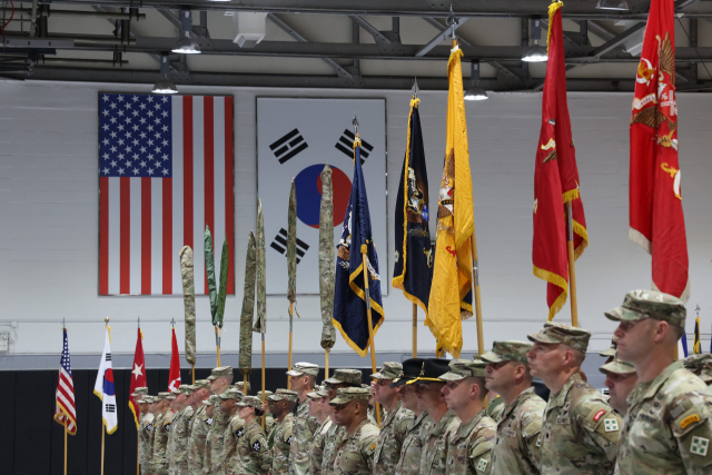 6일 경기도 동두천시 캠프 케이시에서 열린 미2사단·한미연합사단 순환배치 부대 임무교대식에서 미4사단 제2스트라이커 전투여단이 부대기를 펼치며 9개월간의 한반도 배치 임무를 시작하고 있다. 연합뉴스