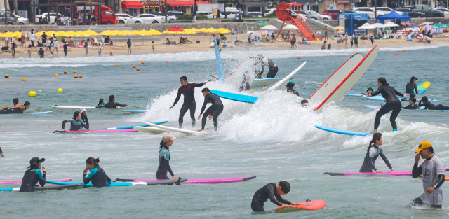 장마가 소강 상태로 접어든 9일 부산 해운대구 송정해수욕장에서 서퍼들이 서핑과 해수욕을 즐기고 있다.