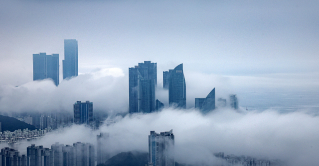 장맛비가 소강상태를 보인 9일 오후 부산 해운대구와 수영구 일대 해안가에 해무가 껴 장관을 이루고 있다. 4~10월 해안 지역에서 주로 발생하는 해무는 더워진 육지의 공기가 상대적으로 차가운 바닷물을 만날 때 발생한다.