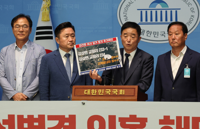 더불어민주당 서울~양평 고속도로 특혜의혹 진상규명 특별팀(TF) 강득구 단장이 9일 오후 서울 여의도 국회 소통관에서 열린 긴급기자회견에서 발언하고 있다(위). 전진선 양평군수와 국민의힘 소속 경기도의원·군의원들이 9일 오전 서울 여의도 더불어민주당 중앙당사를 방문해 서울~양평 고속도로 사업과 관련한 양평군의 입장을 밝히고 있다. 연합뉴스