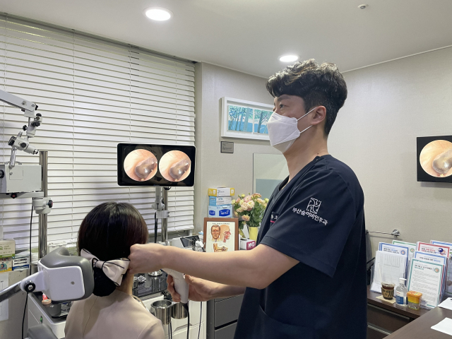 BS숨이비인후과 김동조 원장이 어지럼증의 원인을 파악하기 위해 내시경으로 외이도 및 고막을 검사하고 있다. BS숨이비인후과 제공