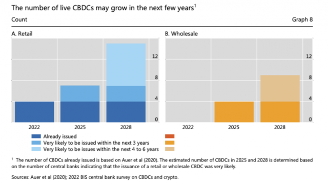 중앙은행들은 2028년까지 최대 24개의 CBDC가 운영될 수 있다고 응답했다. BIS 제공.