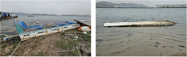 낙동강 하구 무인도서 폐기물 사진(왼쪽부터 진우도의 트럭 활어통, 폐선). 해수부 제공