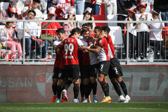 지난 3월 19일 부산아시아드주경기장에서 열린 홈 개막전에서 김천 상무를 3-1로 꺾은 부산아이파크 선수단과 팬들이 승리를 자축하며 기념촬영하고 있다. 부산아이파크 제공