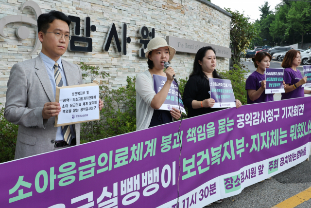 시민단체 '정치하는엄마들'에서 활동하는 두 어린이의 엄마 윤은미씨가 4일 오전 서울 종로구 감사원 앞에서 열린 '소아 응급의료 체계 붕괴 책임을 묻는 공익감사청구 기자회견'에서 본인이 직접 겪은 소아 응급환자의 진료 거부 사례에 대해 설명하고 있다. 연합뉴스