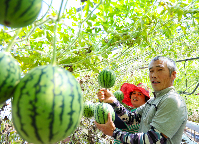 경남 산청군의 한 농장에서 애플수박 수확이 한창이다. 어른 얼굴 만한 수박이 주렁주렁 매달렸다. 크기는 작지만 당도가 높은 애플수박은 사과처럼 깎아 먹을 수 있다. 산청군 제공