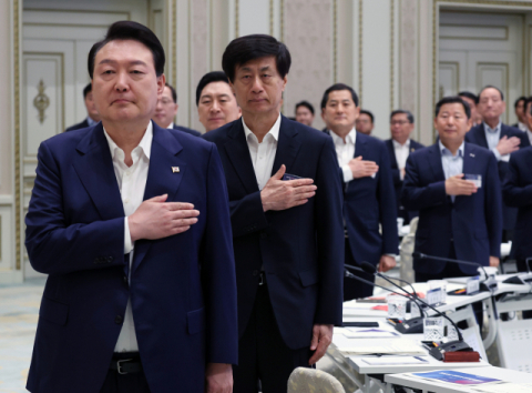 윤석열 대통령이 지난 4일 청와대 영빈관에서 열린 2023년 하반기 경제정책 방향에 관한 제18차 비상경제민생회의에서 국기에 경례하고 있다. 연합뉴스