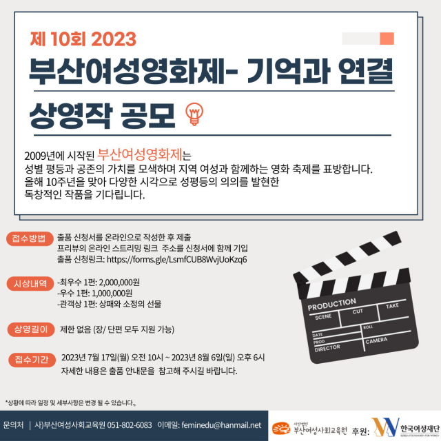 부산여성영화제 작품 공모에 대한 자세한 정보는 홈페이지에서 확인할 수 있다. 제10회 부산여성영화제는 올해 10월 20~22일 중구 신창동 BNK부산은행 아트시네마 모퉁이극장에서 열릴 예정이다.