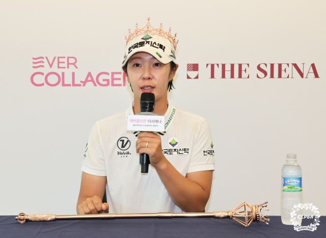 16일 제주시 더시에나 컨트리클럽에서 끝난 KLPGA 투어 '에버콜라겐·더시에나 퀸즈크라운' 대회에서 시즌 두 번째 우승을 차지한 박지영이 왕관을 쓰고 인터뷰에 나서 우승 소감을 밝히고 있다. KLPGA 제공