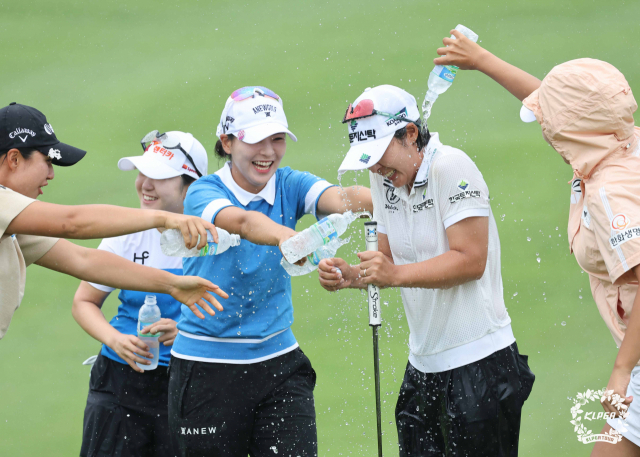 16일 제주시 더시에나 컨트리클럽에서 끝난 KLPGA 투어 '에버콜라겐·더시에나 퀸즈크라운' 대회에서 시즌 두 번째 우승을 차지한 박지영(오른쪽 두 번째)이 동료 선수들의 축하 물세례를 받고 있다. KLPGA 제공