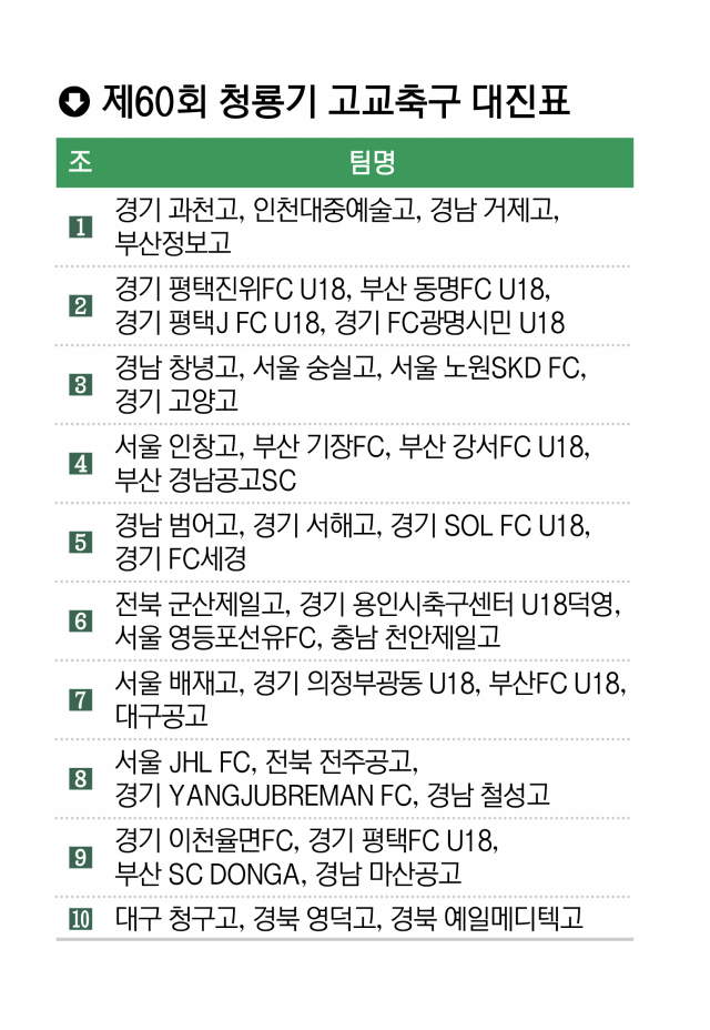 지난 4일 부산일보사 10층 대강당에서 진행된 조 추첨 결과에 따라 39개 팀은 10개 조로 나뉘어 조별리그 예선을 치른다. 각 조 1, 2위 20개 팀이 본선 토너먼트를 거쳐 청룡기 최종 주인공을 가린다.