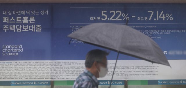 한국은행이 지난 13일 기준금리를 연 3.5%로 네 차례 연속 동결했지만, 주택담보대출 등 대출금리는 연일 상승세를 지속하고 있다. 서울 시내 한 시중은행 앞에 붙어 있는 대출상품 관련 현수막. 연합뉴스