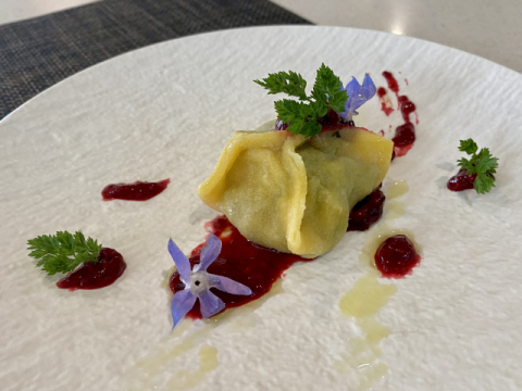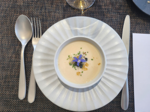부산시가 부산 음식 23종을 새롭게 개발했다. 위쪽부터 전채요리 '콩국물 가스파쵸'와 '전복 편수 라비올리'. 부산시 제공