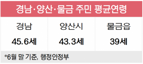 양산시에서도 양산갑은 특히 ‘젊은’ 선거구다. 특히 평균연령이 39세인 물금읍에 유권자 절반이 몰려 있다. 2020년 총선 당시 양산갑 유권자 15만 3416명 가운데 물금읍 유권자가 8만 5072명으로 55%에 달했다. 물금읍 인구는 올해 6월 기준 11만 9782명으로 경남 읍면동 가운데 가장 많다. 사천시나 밀양시도 물금읍보다 인구가 적고 함안군, 거창군, 창녕군 등은 인구가 물금읍 절반 수준이다. 물금읍의 평균 연령은 경남 전체 읍면동 가운데 9번째로 낮다.