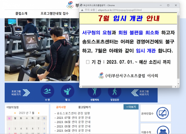 사진은 운영난으로 예산 소진 시까지 임시 개관한다는 센터 측 팝업창. 송도스포츠센터 메인 홈페이지 캡쳐
