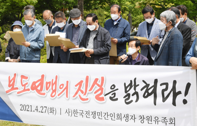 한국전쟁민간인희생자 창원유족회 회원들은 2021년 4월 경남도청 앞에서 보도연맹 사건 진상 규명을 요구했다. 경남신문 제공