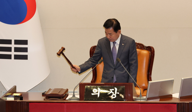 김진표 국회의장이 18일 서울 여의도 국회에서 열린 본회의에서 의사봉을 두드리고 있다. 연합뉴스