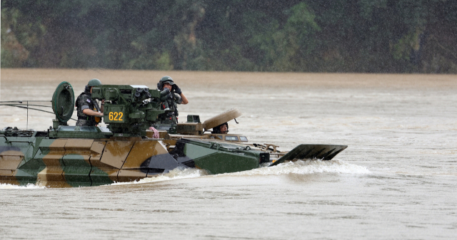 해병대 1사단 상륙돌격장갑차 KAAV가 18일 오후 경북 문경시 영순면과 예천군 풍양면 경계에 있는 삼강교 주변에서 폭우 실종자 수색 작업을 하고 있다. 연합뉴스