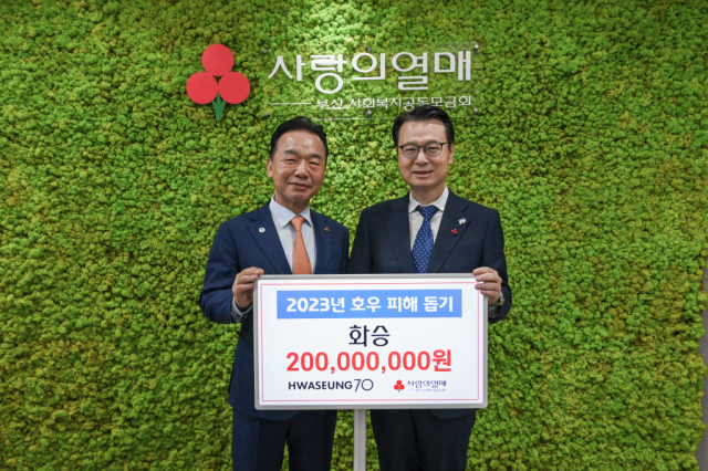 화승그룹은 19일 집중호우로 피해를 입은 지역의 신속한 복구와 이재민 구호를 위해 2억 원을 긴급 지원한다고 밝혔다. 화승그룹 계열사인 화승네트웍스 박동호 대표이사(오른쪽)와 최금식 부산사회복지공동모금회 회장. 화승그룹 제공
