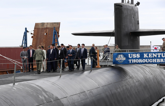 윤석열 대통령이 19일 부산 남구 해군작전사령부 부산작전기지에 입항한 미국의 오하이오급 전략핵 잠수함인 켄터키함(SSBN-737)에 올라 있다. 연합뉴스