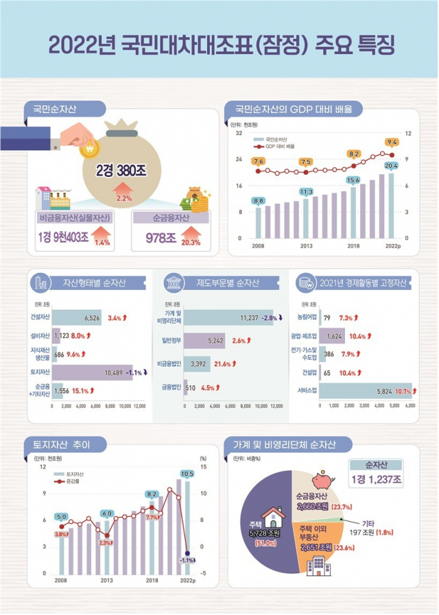 가계 및 비영리단체뿐 아니라 금융·비금융법인, 일반정부의 순자산을 모두 더한 '국민순자산'은 지난해 말 2경 380조 원에 이르렀다. 1년 전(2021년 말)보다 441조 5000억 원(2.2%) 늘어 역대 최대를 경신했지만, 증가율(2.2%) 자체는 지난 2008년 통계 편제 이후 가장 낮았다.