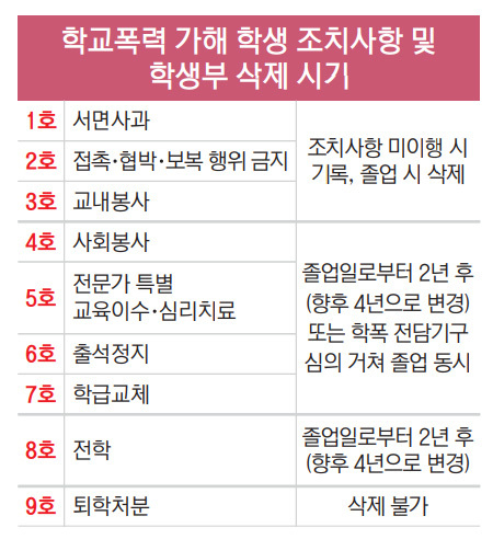 학폭위 조치는 1호 서면사과, 2호 접촉·협박·보복행위 금지, 3호 교내 봉사, 4호 사회봉사, 5호 특별교육·심리치료, 6호 출석정지, 7호 학급교체, 8호 전학, 9호 퇴학으로 구분된다. 심각성, 반복성, 지속성, 반성 정도, 화해 정도를 점수로 매겨 학폭위가 결정한다.