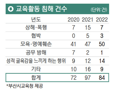 교육부에 따르면 전국의 교권 침해 심의 건수는 2020년 1197건에서 2021년 2269건, 2022년 3035건으로 지속적으로 늘어났다. 부산에서도 지난해 교권 침해 심의 84건이 진행됐다. 상해·폭행이 7건이었고 모욕 명예훼손은 50건에 달했다. 2021년에는 성적 수치심 관련 등으로 5건이 신고됐다. 교원단체 등은 교사가 신고하지 않는 경우가 대다수인 만큼 실제 교권 침해 사례는 더 많을 것이라고 본다.