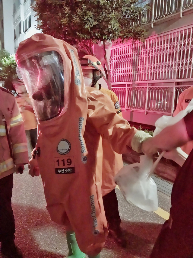 부산소방재난본부 소방대원이 지난 22일 오후 방호복을 입고 부산의 한 지역에서 신고된 정체불명의 국제 우편물을 수거하고 있다. 수거된 우편물은 부산환경연구원에 이송됐다. 부산소방재난본부 제공